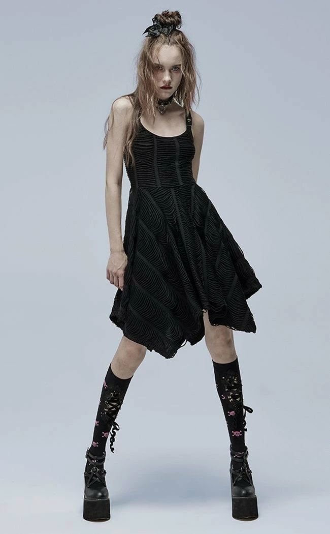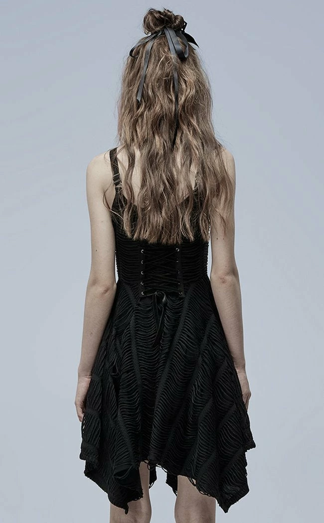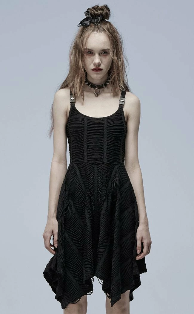 Look damn fine in sexy shreds with the Retrograde Slip Dress! The elastic fabric is slashed in flattering lined segments, adding to the destroyed feel of the asymmetrical hem of the skirt. The unique, statement straps feature a buckle closure and you can tighten the dress as needed with the corset on the back.