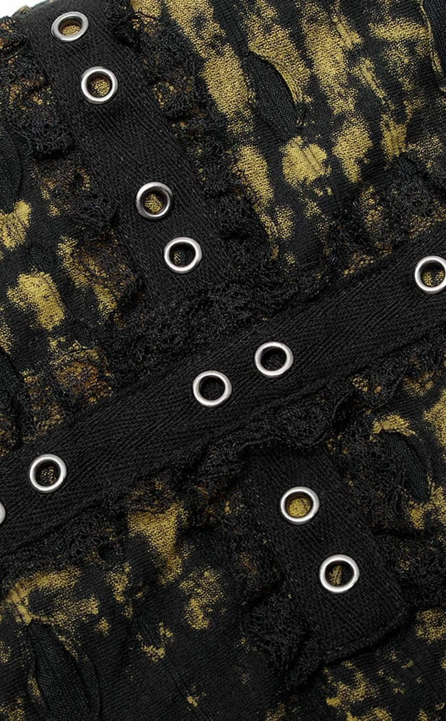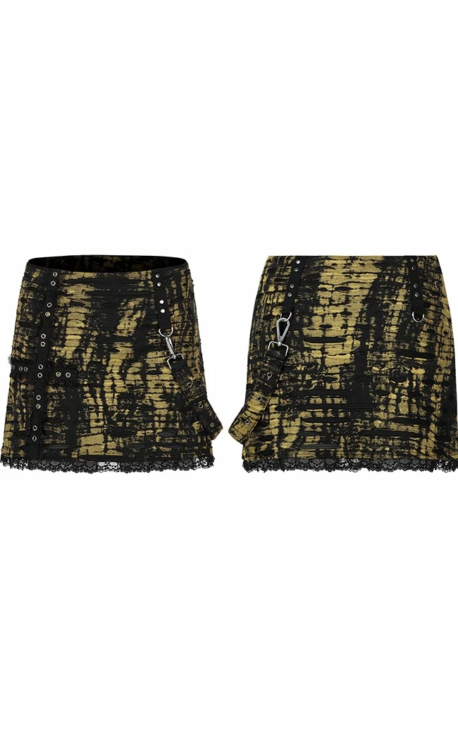 The Risen Mini Skirt features toxic yellow/black fabric that stretches with you, decked out with statement strap details, D rings, a removable bondage strap, eyelets and lace trims to add an elegant touch to yer punk edge.