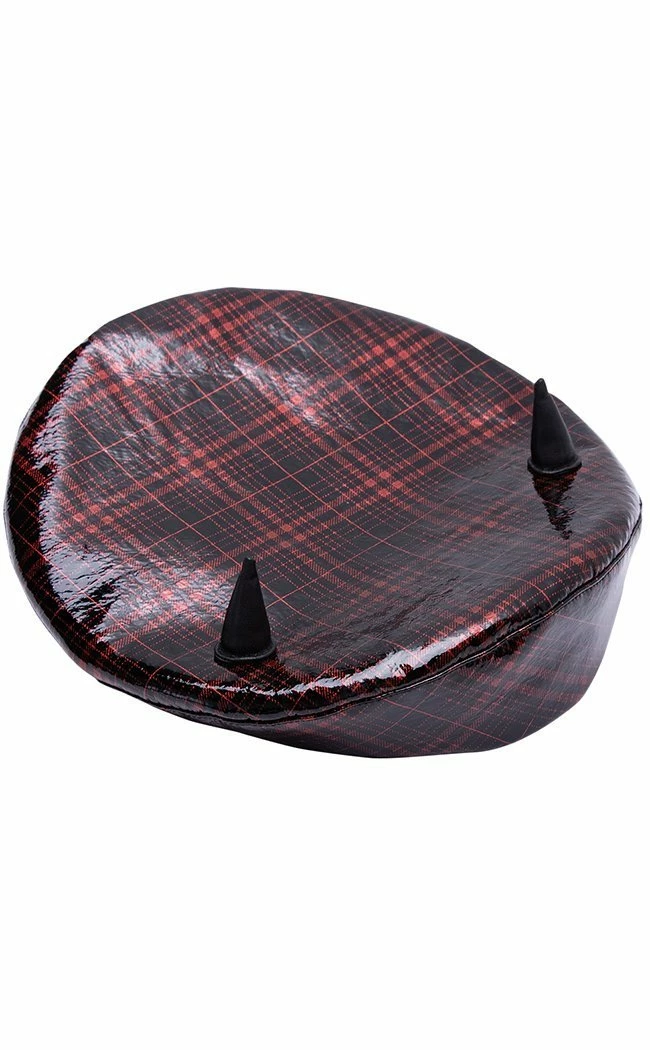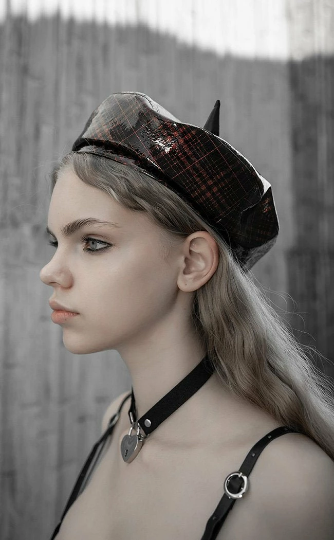 This cap comes with its own devilish charm. The body is made of unique paten tartan, topped off with two vegan leather horns.  Perfect for festivals or kicking through the gates of hell.