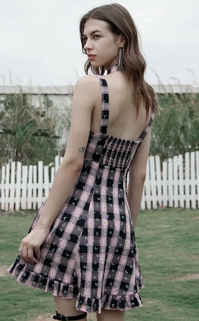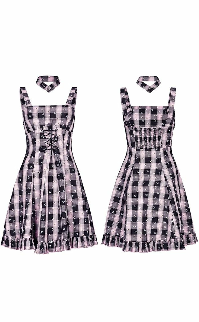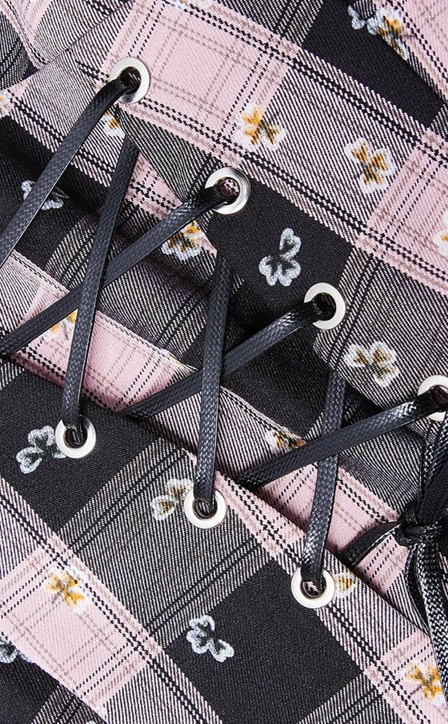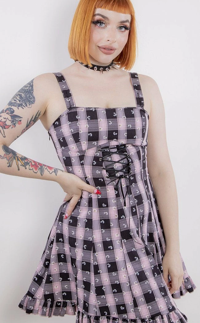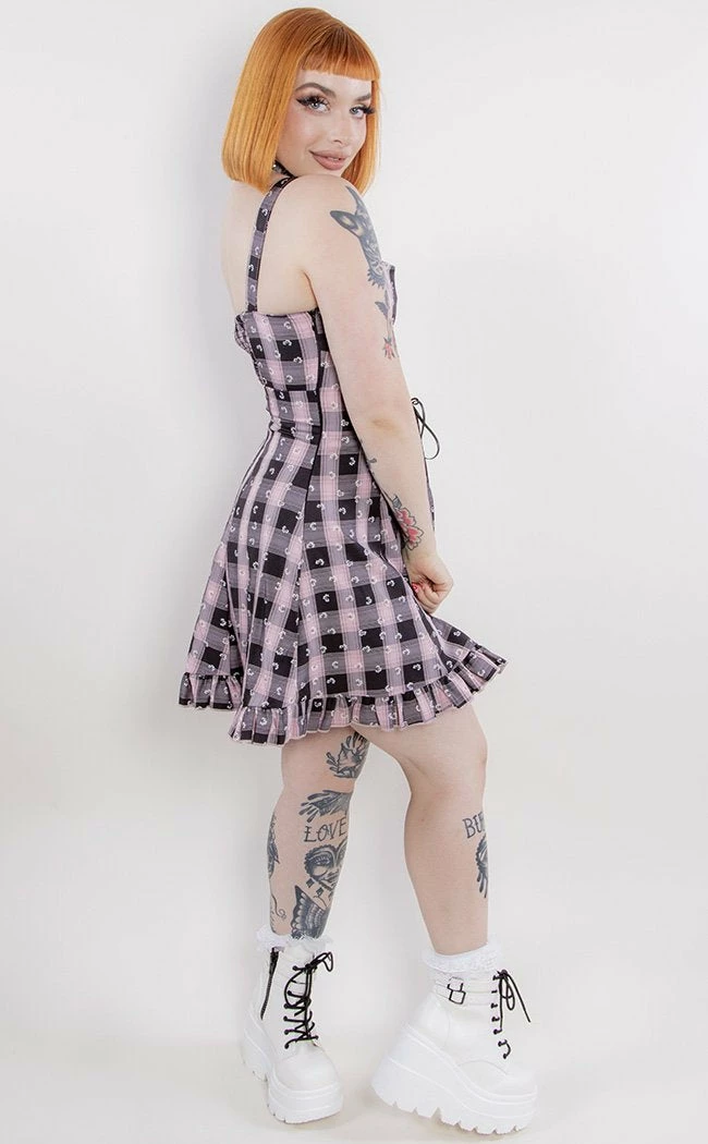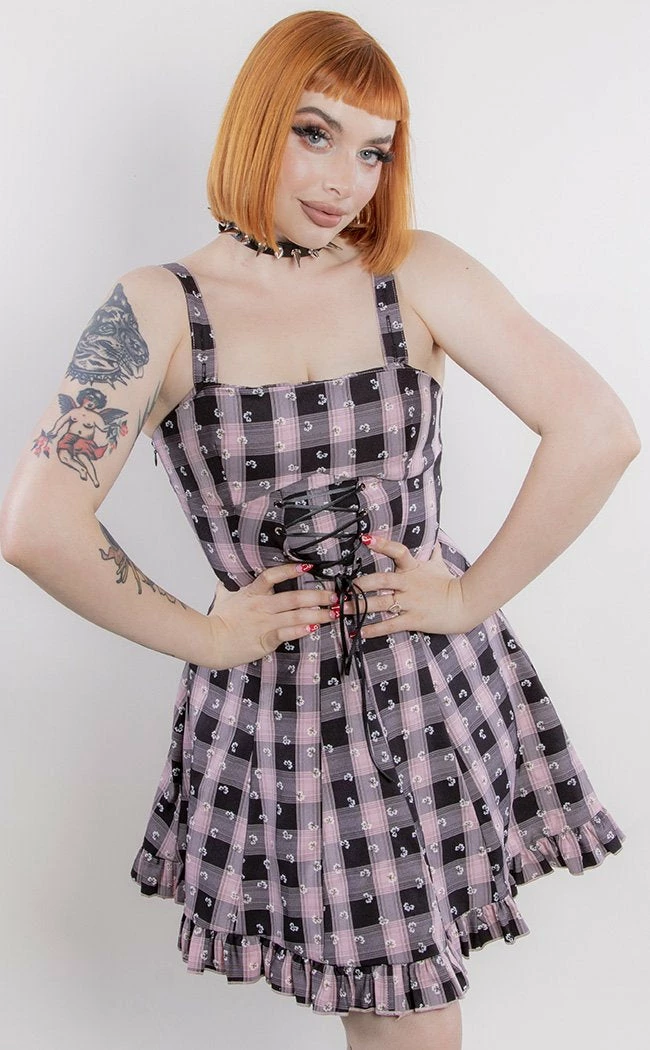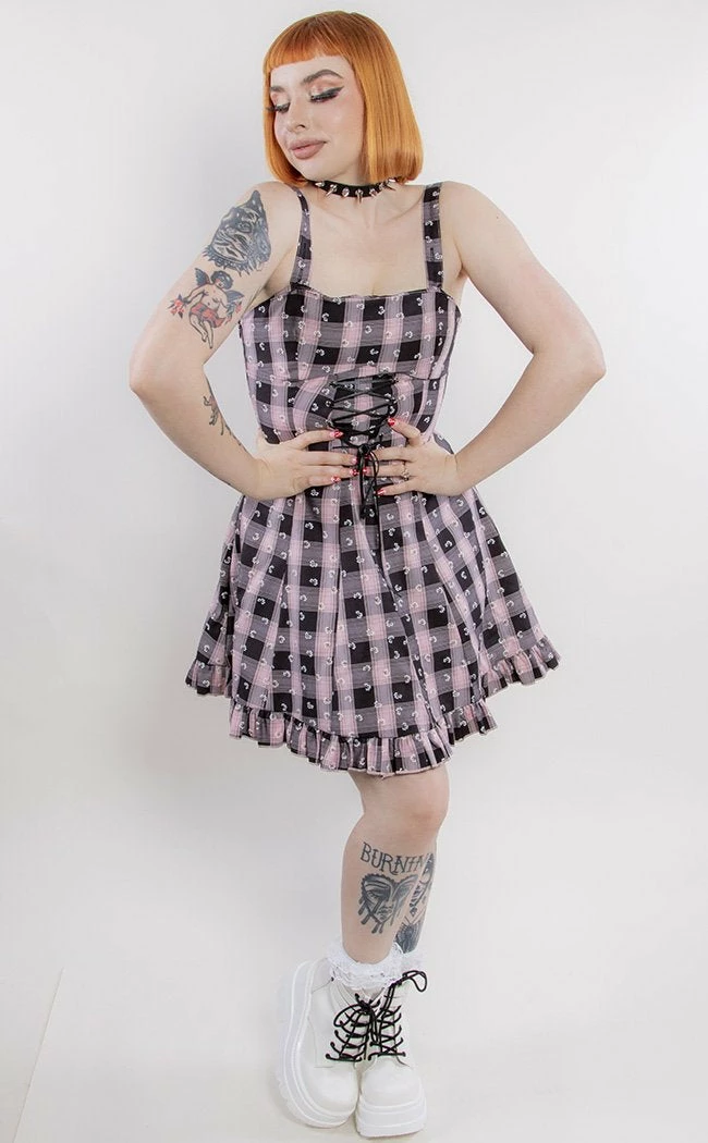 Flaunt yer inner cottagegoth with pastels and frills!Β This mini is a charming baby pink and black check printed with lucky clovers in white and butter yellow for a little extra luck.Β The waist is fitted with a corset detail and the skirt is hemmed in ruffles.Β The ensemble completes with a bonus collar so you’ll never have trouble accessorising!