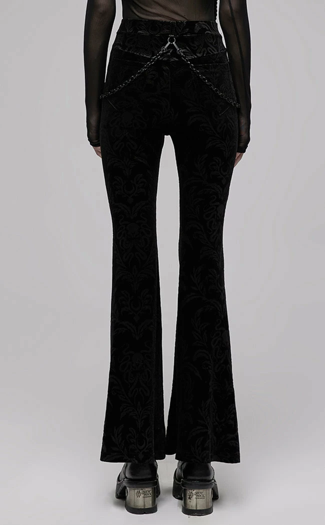 Add some eldritch luxury to yer wardrobe with the Strange Eons Velvet Flares!Β These babies are fitted and sit high on the waist, showing some skin with a statement mesh panel at the navel. The fabric is embossed with a Cthulhu motif as an extra spooky detail, complemented by the removable chains that hang flatteringly over the hips.
