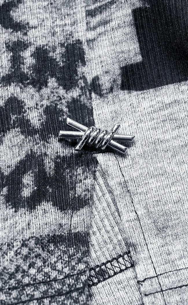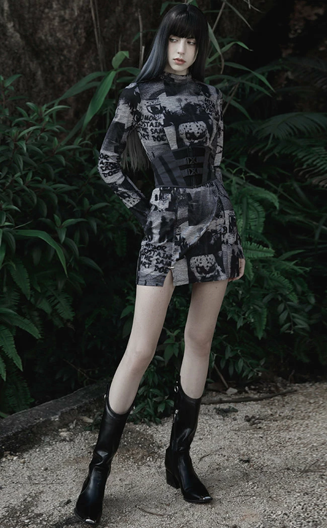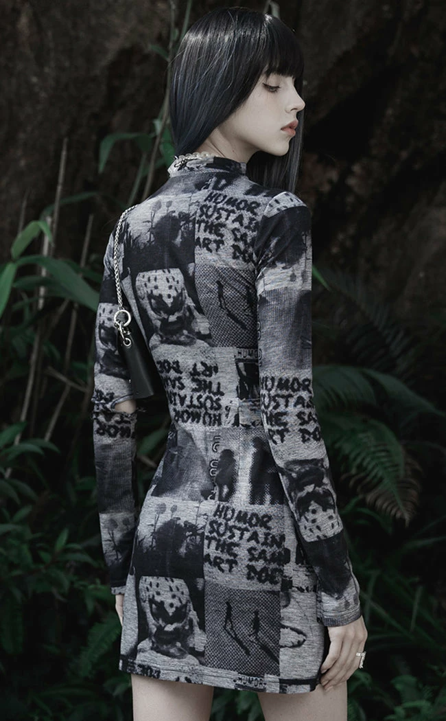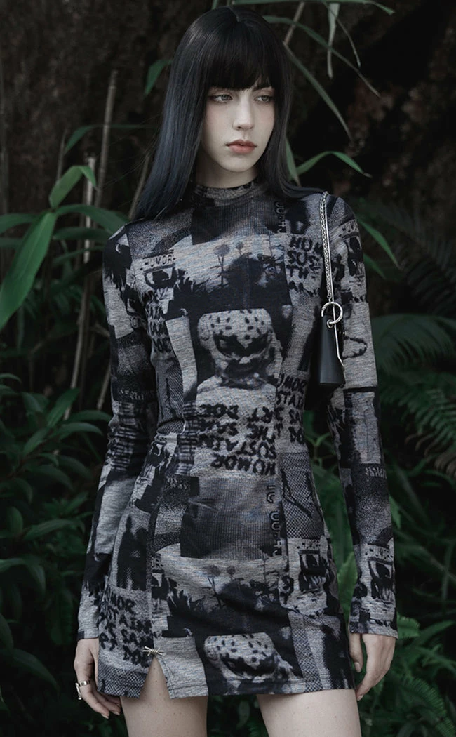 Make the front page in the Tabloid Fodder Dress!Β Made from super soft fabric with a poster effect print, this dress features long sleeves with thumbholes and a shirt hem with short slits. The high neckline opens with a push-stud panel for east on/off and the slit comes with a removable barbed wire pin as an extra cute detail.