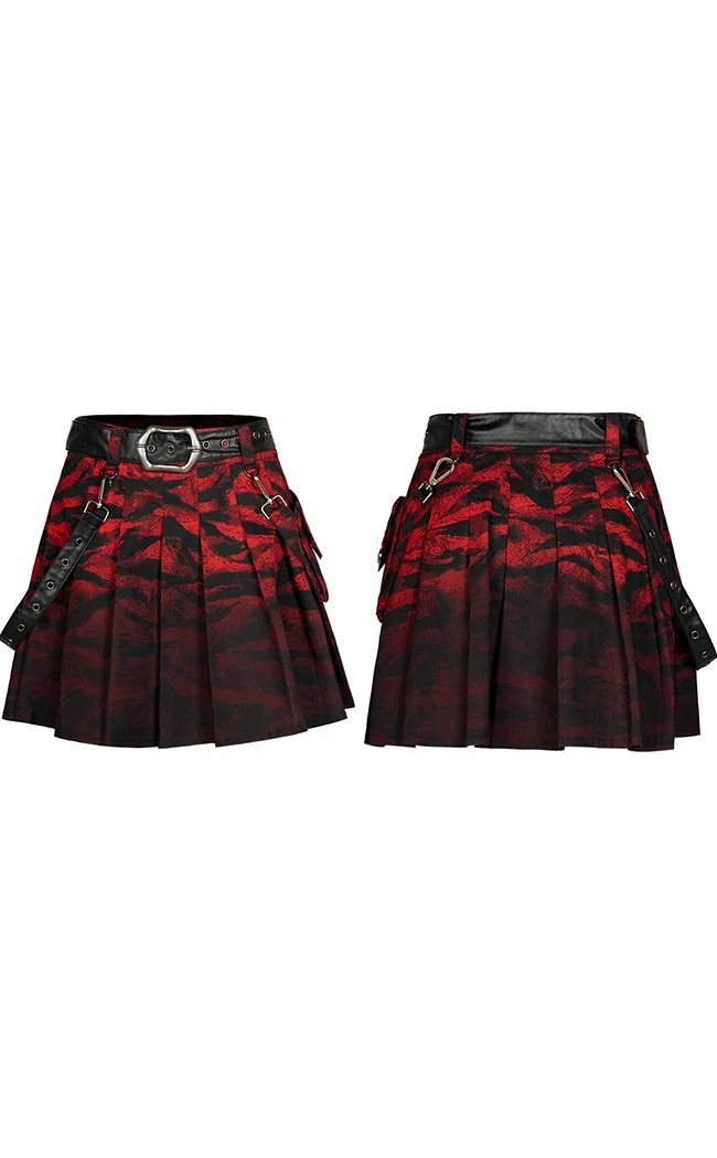 Go wild in the Vicious Pleated Skirt! The animalistic red fabric sits in cute pleats over yer hips, securing at the waist with a faux leather belt.Β Extra deets like a removable suspender strap and pocket with a skeleton button are the final punk touch guaranteed to turn heads.