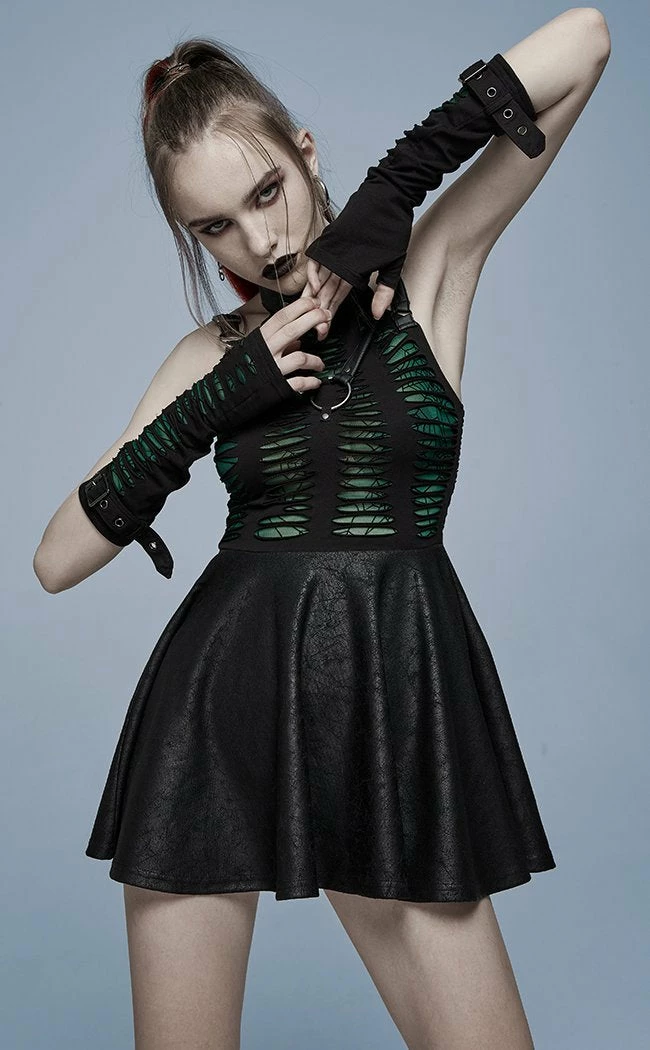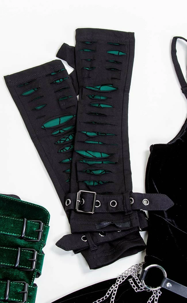 Accessorise with the badass Widow’s Web Armwarmers! Slashed black fabric sits over a layer of mesh with a spiderweb pattern, securing over the arms with an adjustable buckle.