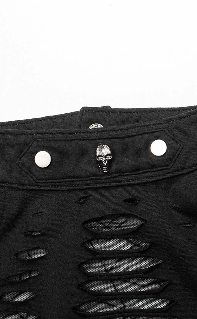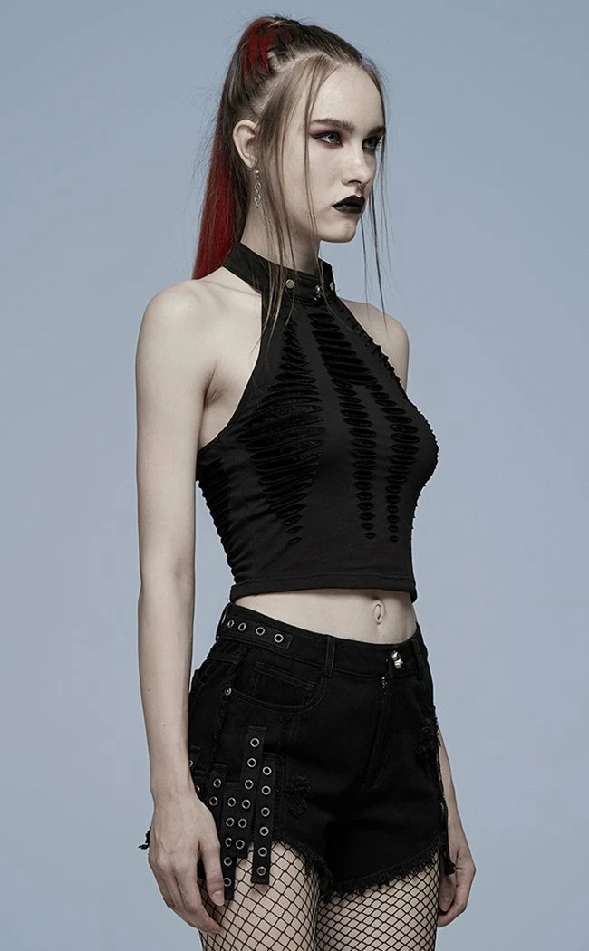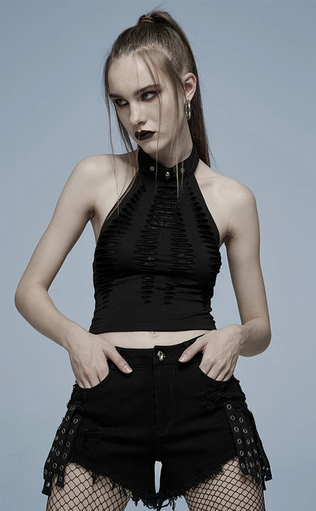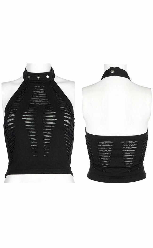 Weave a sexy silhouette with the Widow’s Web Halter Top. A layer of black slashed knit reveals a layer of spiderweb mesh hiding beneath. The high halter neck is adjustable, decked out with a skull charm for an extra deadly flare.
