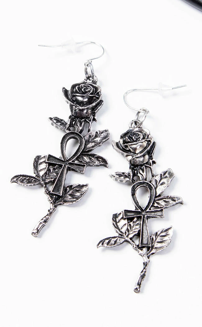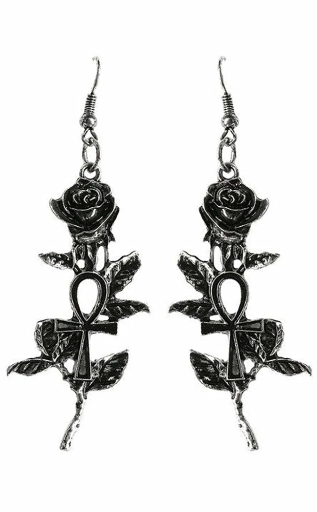 The Ankh Roses Earrings a classic piece of gothic elegance! Two roses hang from hook fastenings as elegant pendants, entwined with ankh symbols in an antique silver finish.Β