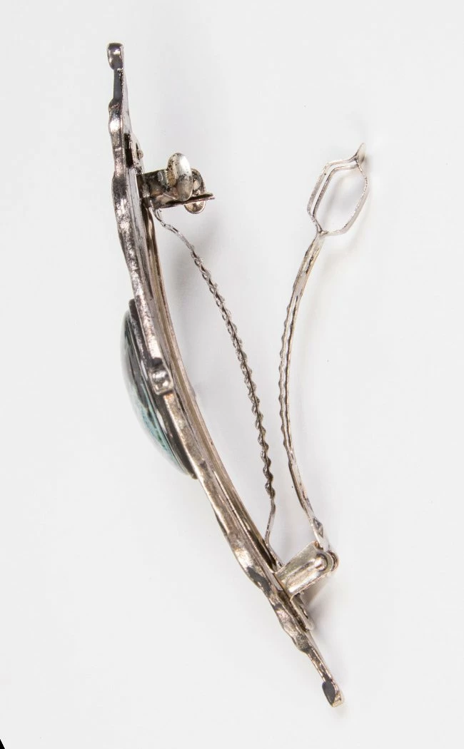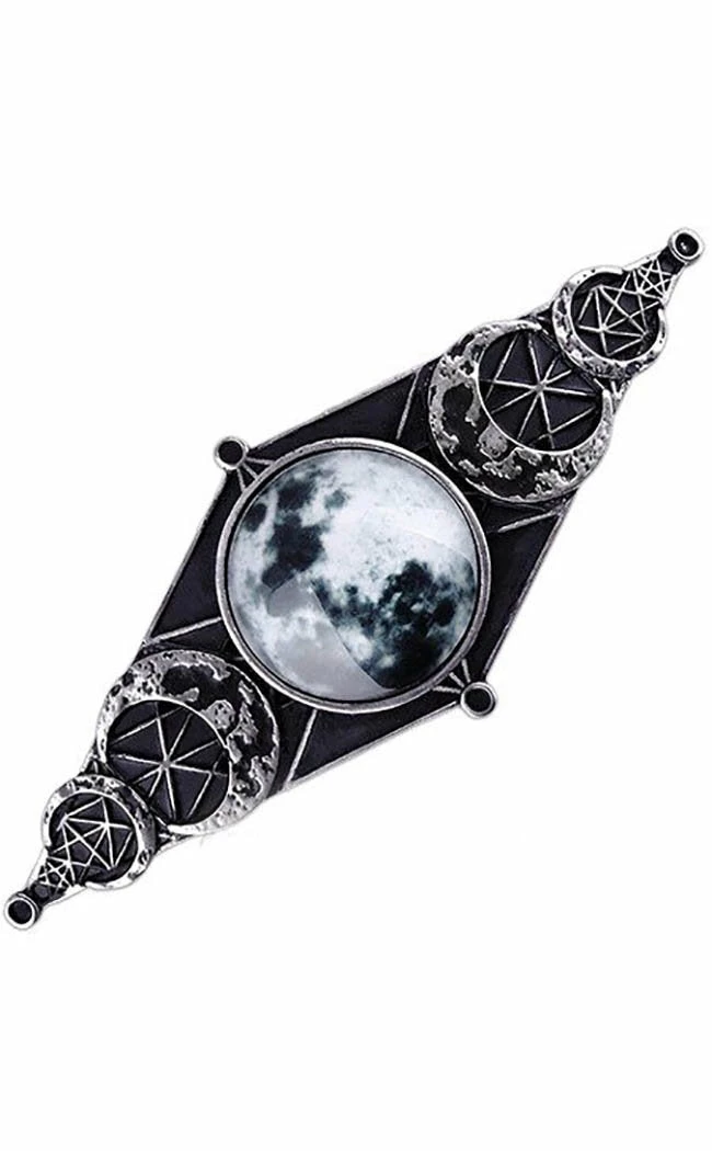 Let your locks glow with the light of the moon! This barette puts the full moon on display under a magnifying glass charm. This is set into a metal backing embossed with geometric patterns.