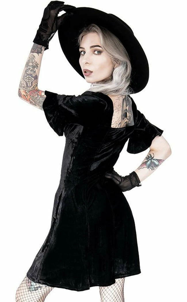 Get yourself an LBD with an unholy feel This velvet dress has a functional silver zip as a feature on the front, secured by a cross decal. The 3/4 sleeves have a slight shoulder puff and are slightly flared, bringing some elegant goth charm to the whole affair.