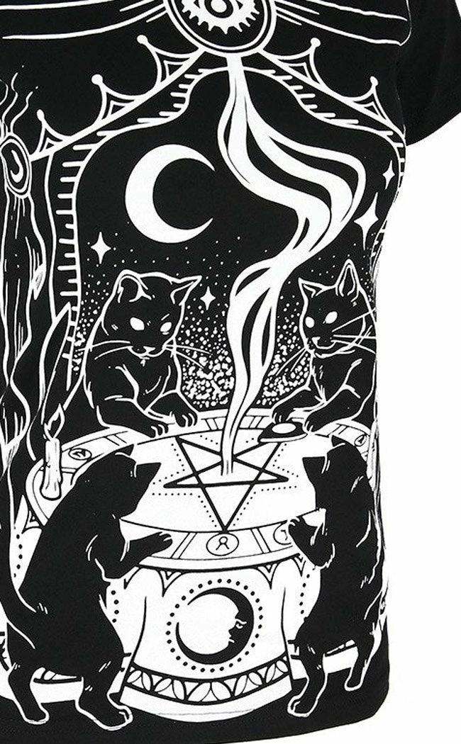 Black cotton gothic slim fit tee with the sabbath of four black cats around a table.