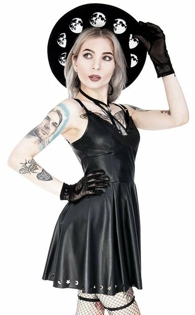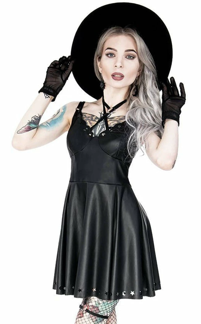 No baddie witch’s wardrobe is complete without a faux leather piece!Β Moon and star cutouts scatter along the neck and hemlines, with the dress material being form fitting and stretch at the chest.