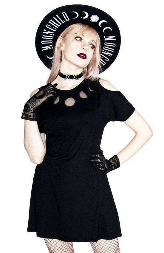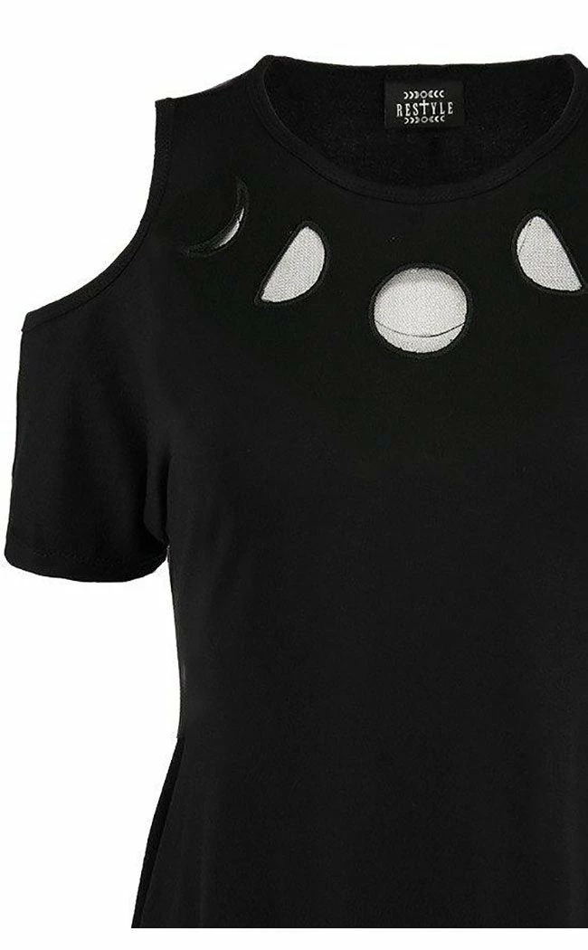 Hey, moonchild!Β A magicalΒ black oversized tunic featuring cold shoulder cutouts and mesh moon phase insert. Wear as a dress or oversized top. Perfect paired with fence net tights or leggings.