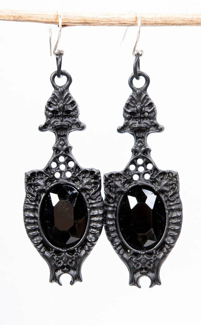 Ooze gothic elegance in the Dark Mirror earrings.Β Black, faceted stones are bordered by the Devil’s horns and crescent moons, all crowned with intricate baroque ornaments. The pieces are finished in shining black, made with durable metal.