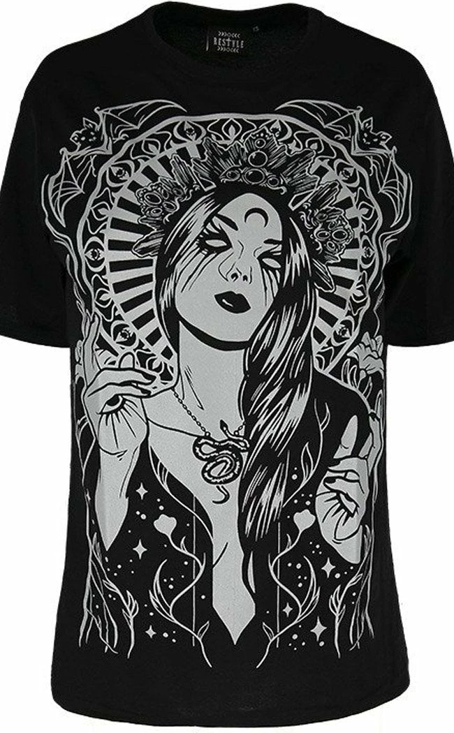 This print depicts a goddess in a cape, adorned with flower and stars motif.Β Relaxed fit & oversize shape.