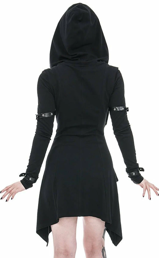 Pay tribute to the goddess in the Hecate Hoodie! Soft cotton heeps you snug and warm, forming an oversized hood and asymmetrical cut that fits flatteringly at the waist. Faux leather buckles trim the sleeves and shoulder, the latter of which is decked out with a chunky metal pentagram. This hoodie can be worn loosely for a more floaty look or secured with a hidden zip that forms the default wrapped look pictured.