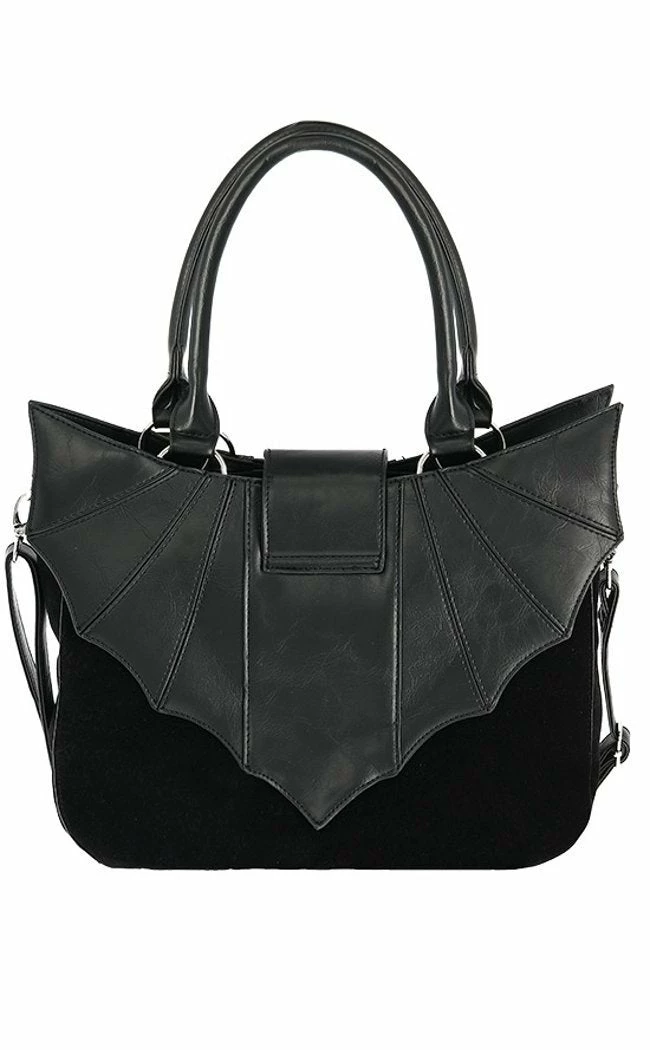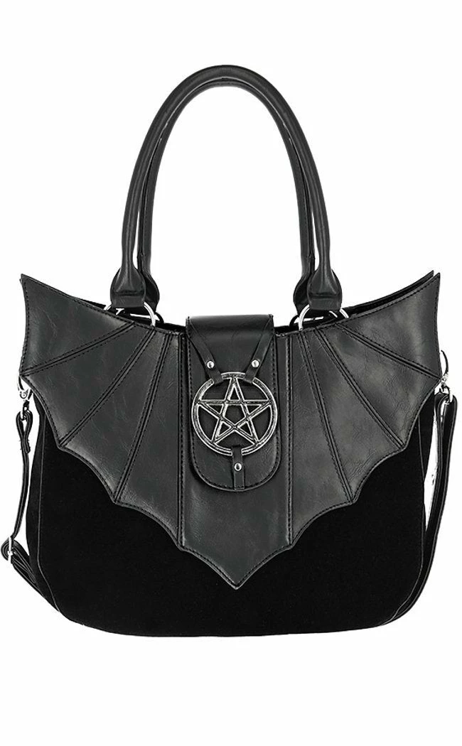 AnΒ chic Goth bag featuringΒ silverΒ pentagram and batwing details. Interior is fully lined and has one zipped pocket. This bag comes with a 120Β cm adjustable shoulder strap.
