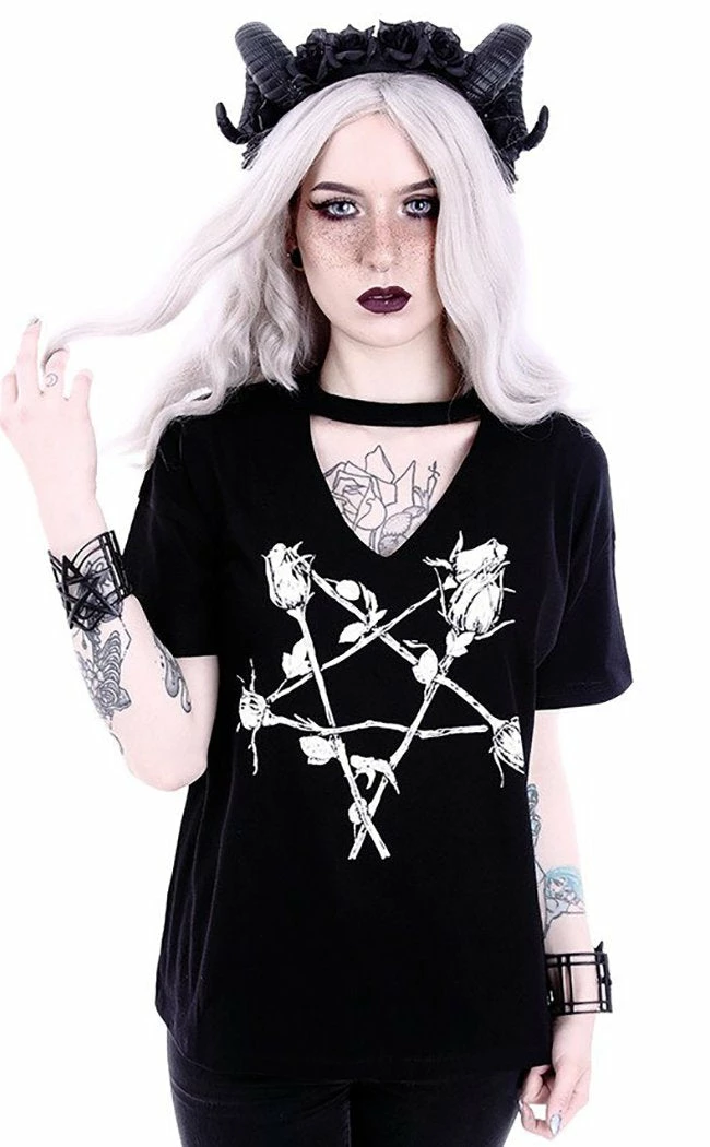 Black cotton gothic classic tee with stunning rose pentagram print.
