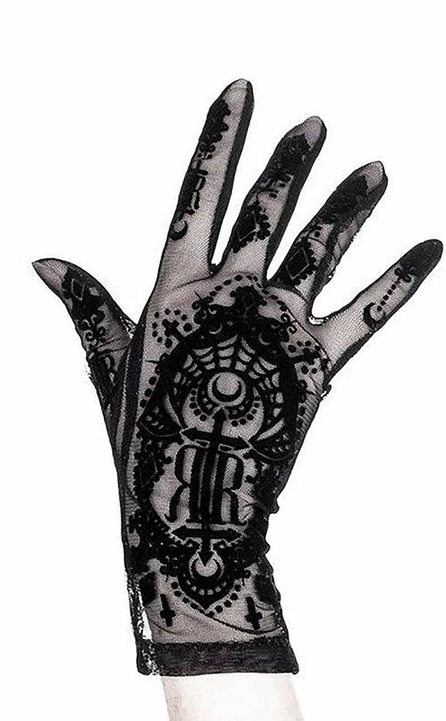 Save a prayer for the Saint Goth gloves! These beautiful accessories are made with a soft, comfortable mesh flocked with spiderwebs, bats, crescents and the Restyle logo.