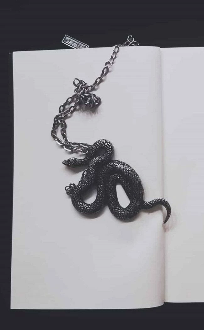A total statement piece. The pendant has an antique silver finish with grunge texture and the writhing snake looks awesome over black clothing!