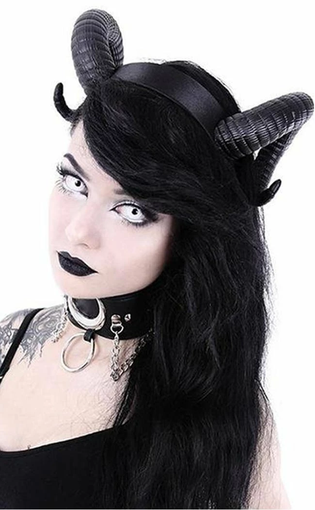 Demon inspired gothic headpiece made up of a wide headband adorned with curved black horns.