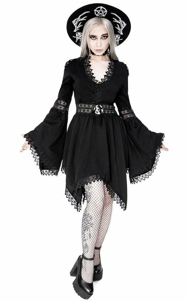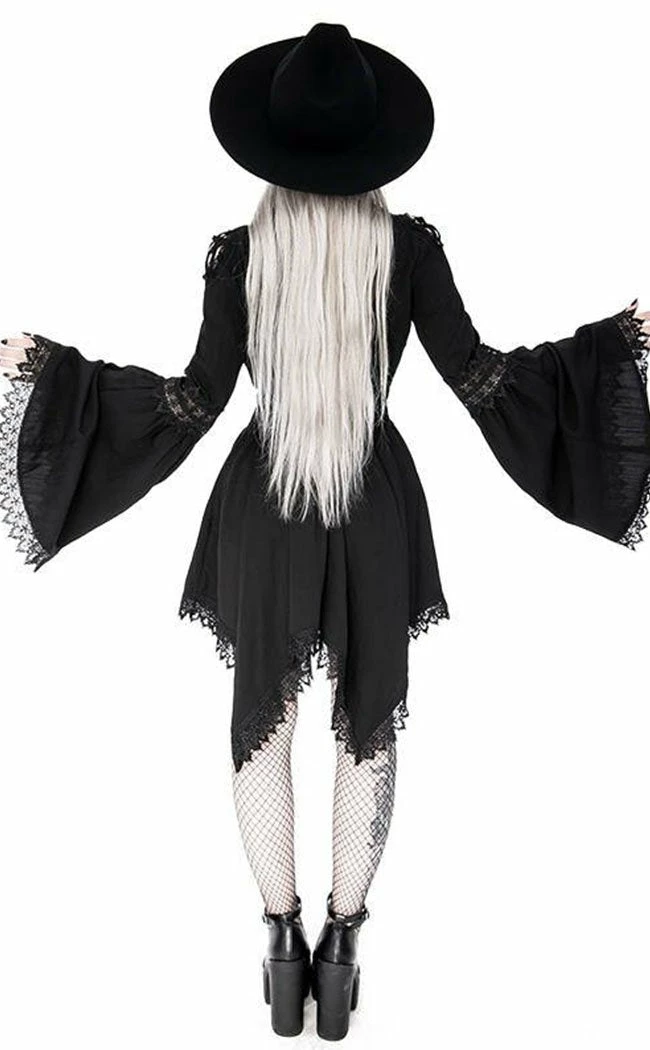 A plunging V neck draws the eye while a pentagram belt decal and shoulder cutouts bring a unique edgy contrast to the lace trims.Β Bell sleeves and an asymmetrical skirt are the finishing ghostly touches on this gorgeous piece.Β