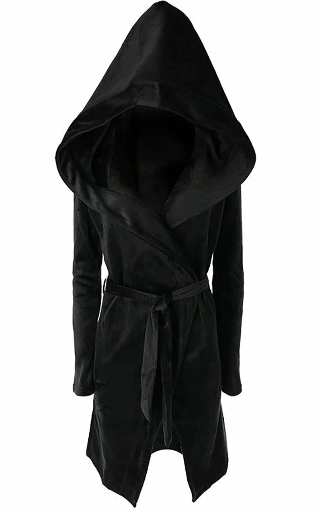 Warm up in luxury with the Velvet Reaper Hoodie! Made with soft, luxe, black velvet, this unique coat features an oversized hood and a versatile silhouette that can be worn open for a casual look or tied at the waist for a tighter fit.