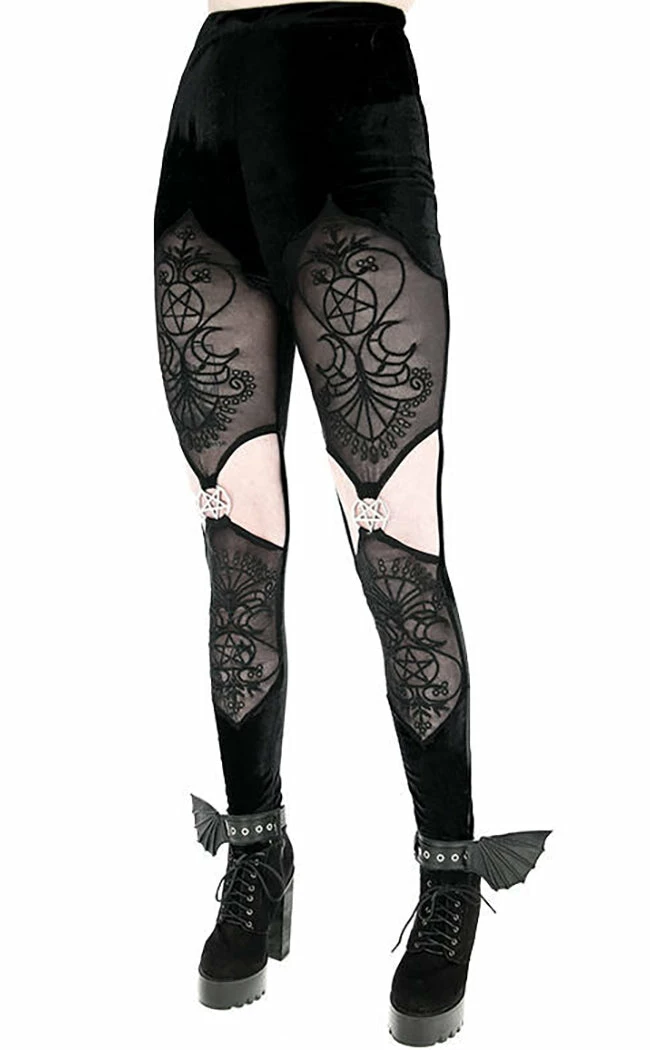 The Vesper Leggings will make a stunning statement without sacrificing comfort. Soft velvet forms these slim-fitting pants with mesh panels flocked with intricate patterns and occult symbols cut into the front. Cutouts on the thighs are decorated with metal pentagram charms.