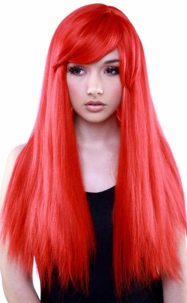 A fringed fire engine red wig of a lighterΒ weight designed to look and feel like your own hair. This wig is straight, long and beautiful, easy to maintain and brush to keep lookingΒ stunning wear after wear.