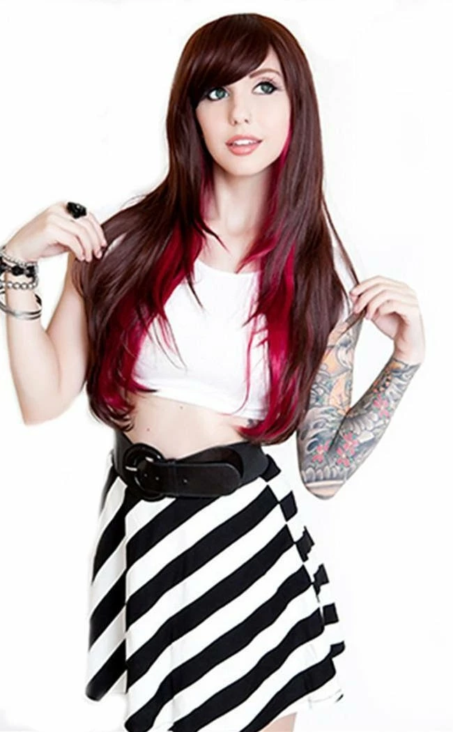 Stunning natural chocolate brown wig with burgundy highlights to frame your face and add a pop of colour.