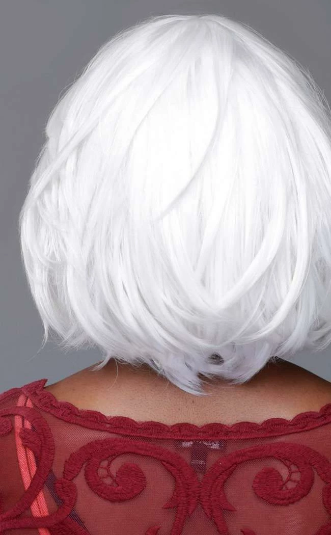 Stunning pure white short wig with super flirty layers. Can be styled messy or straightened into a tidy bob.