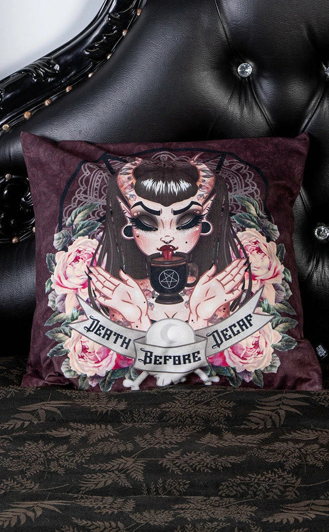 Wake up and smell the coffee with the Death Before Decaf Cushion Cover! Made with soft-touch velvet, this cosy slip features a gorgeous print of a demon with her favourite brew. Perfect for adding a touch ofΒ spooky cafe energyΒ to your lounge or bedroom.