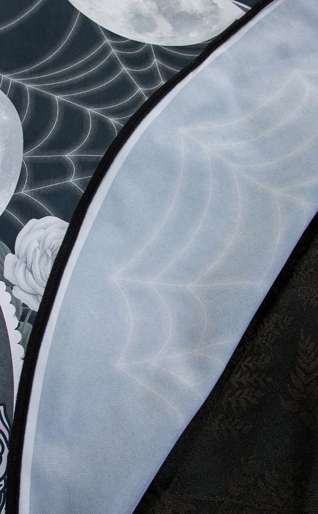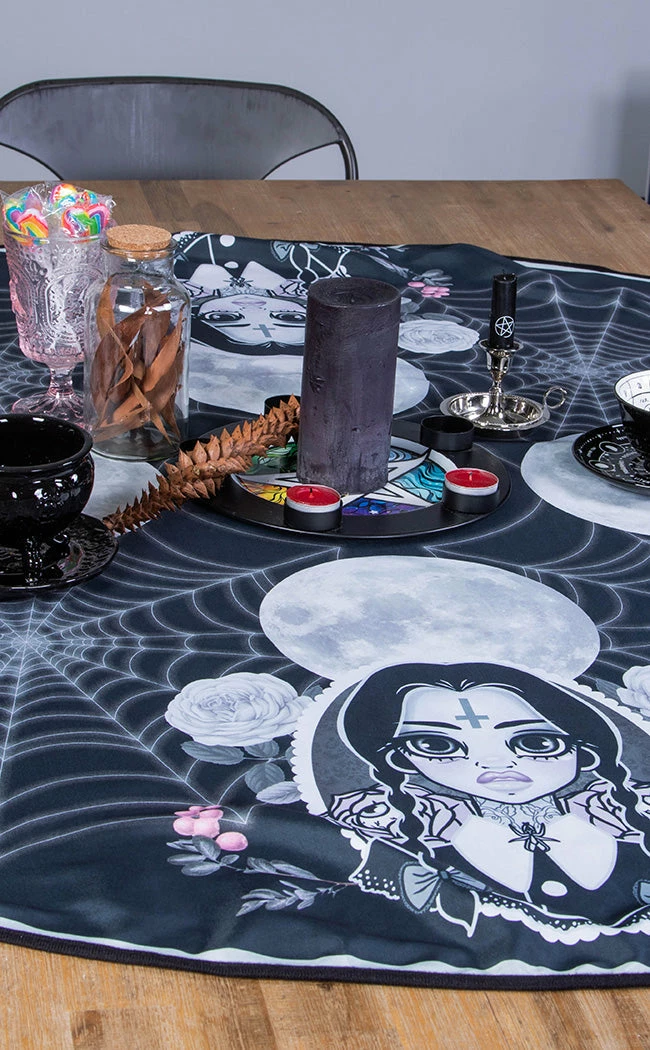 Add some creepy and kooky energy to yer dining room! This round tableclothΒ is a pastel goth dream, featuring artwork of Wednesday Addams surrounded by moons and spiderwebs byΒ the talented Rose Demon.
