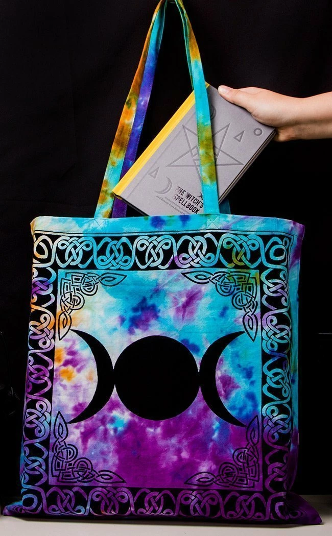 AwesomeΒ turquoise & black cotton tote bag withΒ triple moon design. Perfect for shopping!