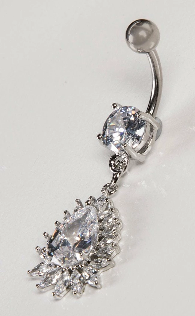 A glittering piece of luxury!Β The dngling charm on this gorgeous navel ring features a teardrop cubic zirconia surrounded by a border ofΒ beautiful matching “petals”.