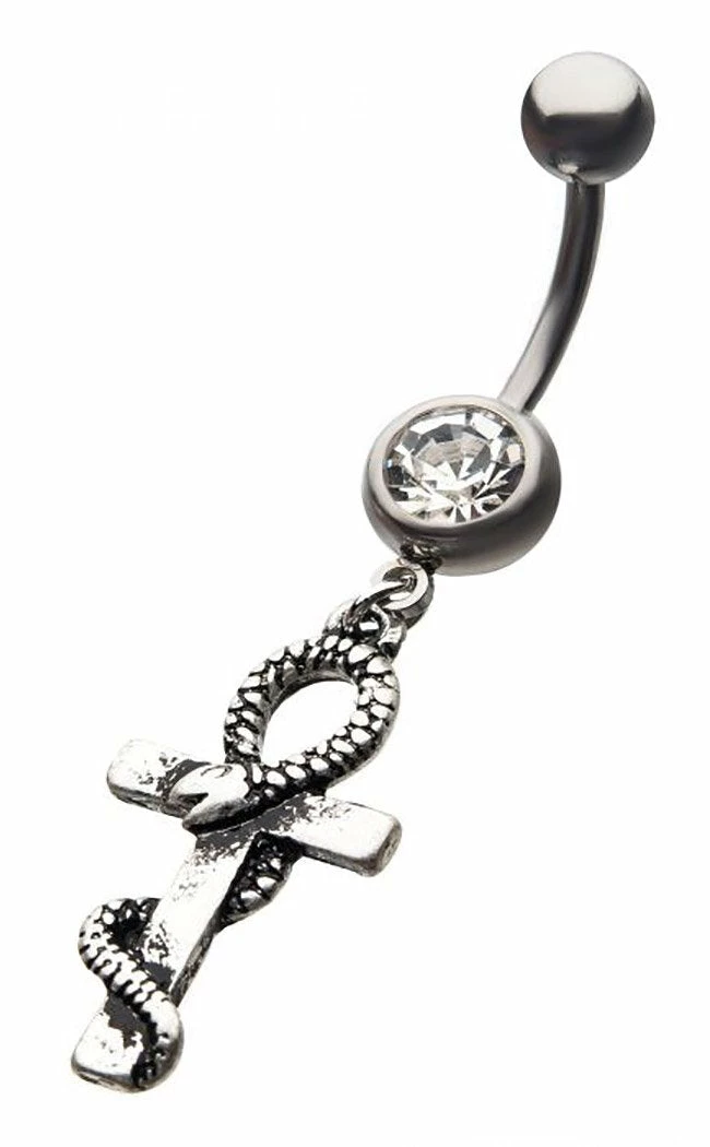 Cubic zirconia stone in the middle with a dangle charm of a snake forming an ankh. Sweet.ย