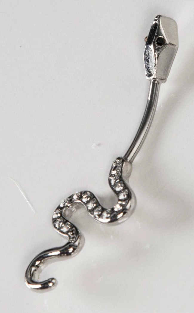 Add some serpentine glitter to your navel!Β This in-n-out piercing is shaped after a twisting snake with glittering clear crystals for scales.