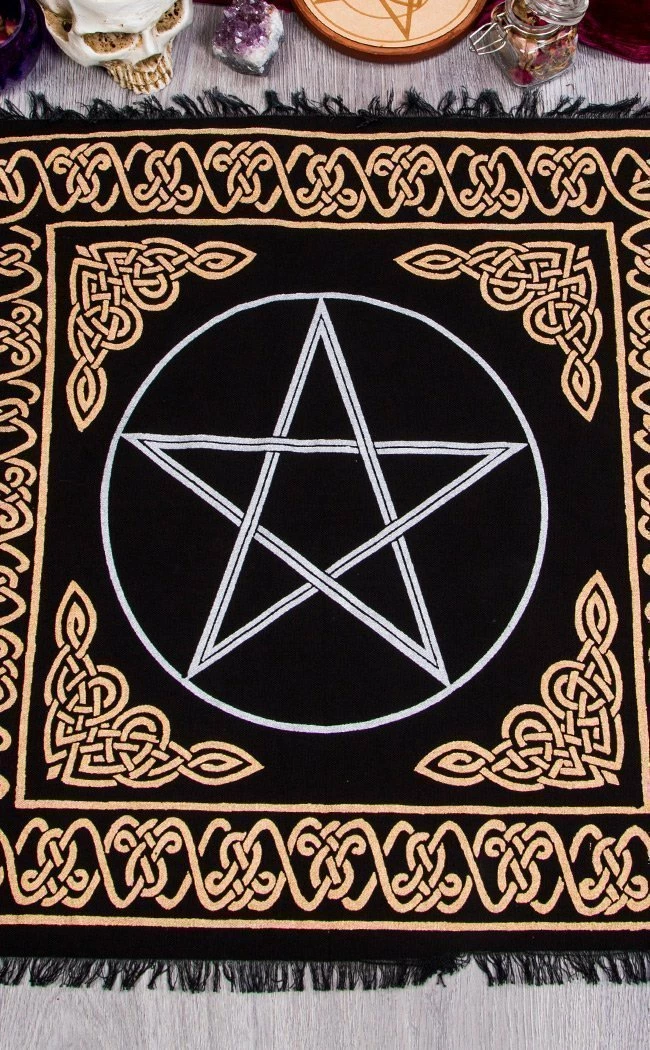 Stunning black and gold pentacle print altar cloth or tablecloth setting the perfect witchy vibe.