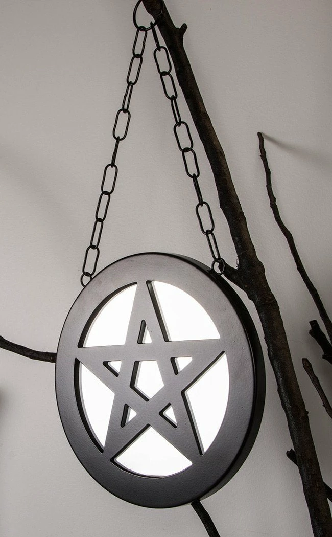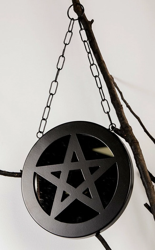 This gorgeous round mirror is enshrouded in matte, black metal, a pentagram crossing over the shining surface.Β This pieceΒ hangs from a bold, thick chainΒ with a ring, making it easy toΒ display around the home or above your altar.