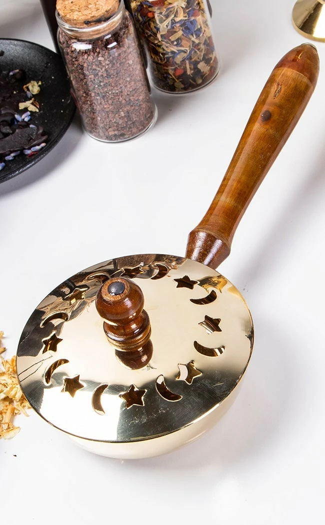 This smoking pan is perfect for cleansing rituals, made for burning herbs and resin incense upon a brass disc. The pan features moon and star cutouts in the lid and the wooden handle fits perfectly in your hand.
