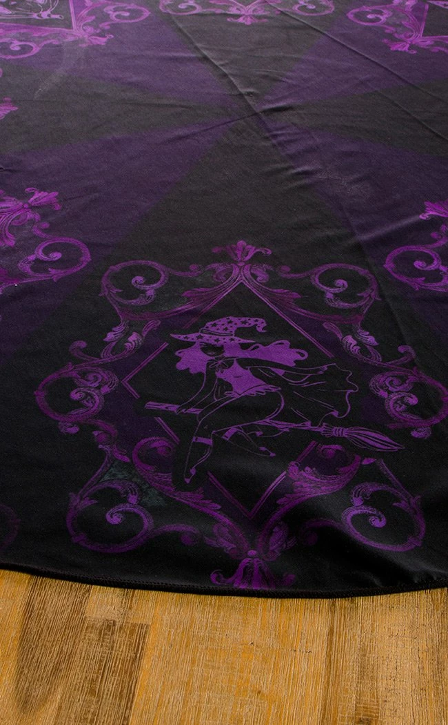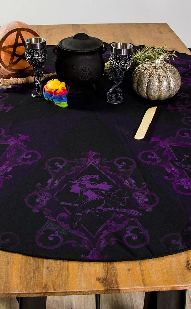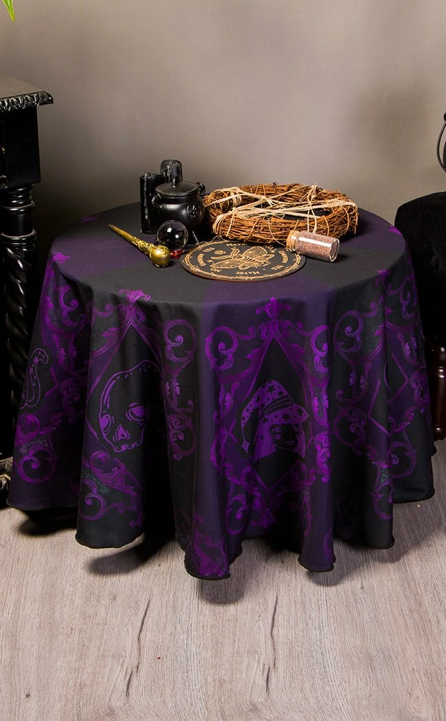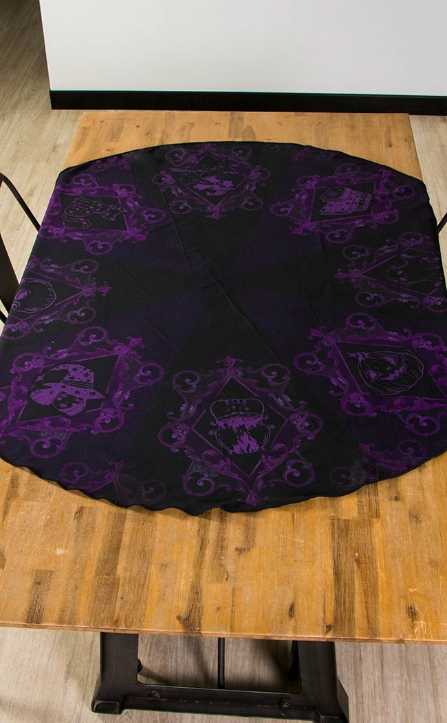 WitchyΒ purples swirl around this inky black tablecloth, forming artwork of horror holiday favourites like cats, Jack O’ Lanterns and cauldrons.Β Spread over your table to simultaneously brighten and darken your dining room and get everyone hungry for a wicked holiday feast!
