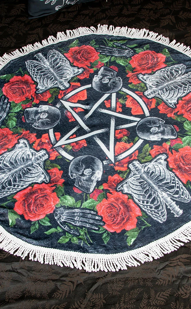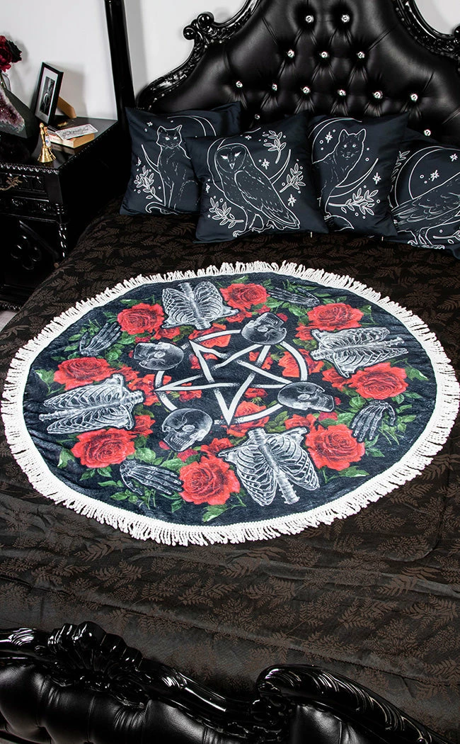 Live out a true gothic romance with the Love You To Pieces Throw Blanket! Made with a luxuriously soft fabric, this blanket features skeletal remains spread out over a border of roses and a white tassel trim.