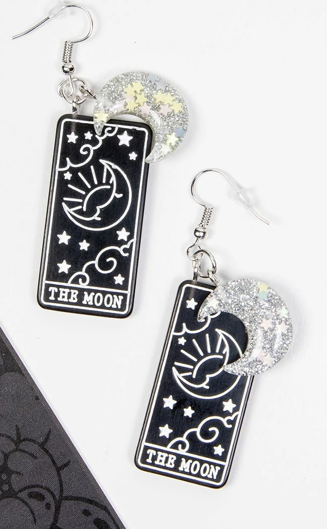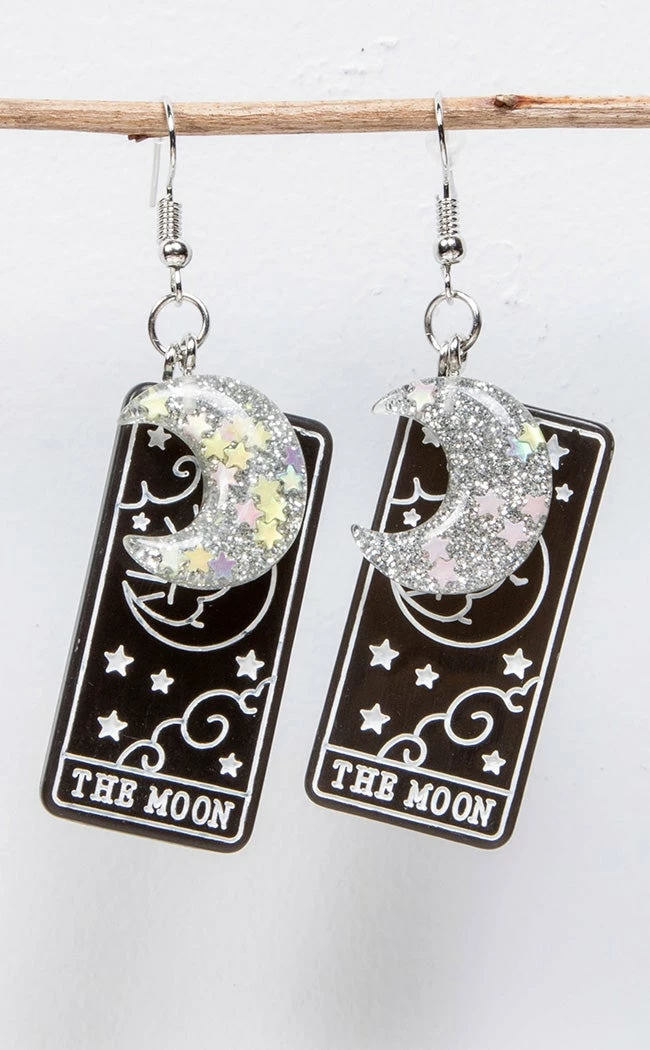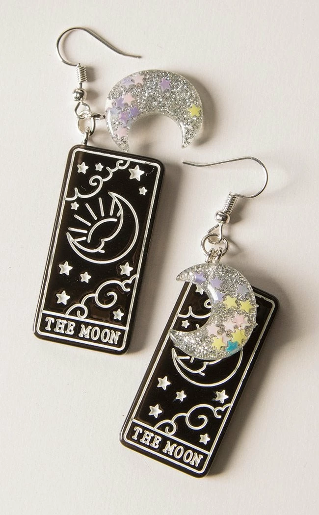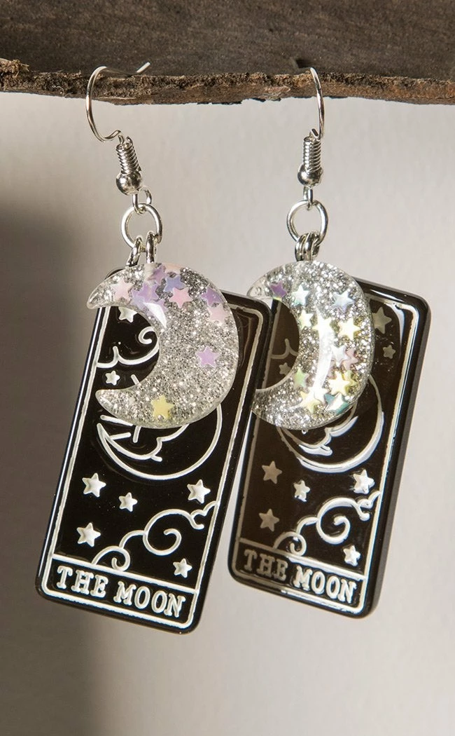 These glitterific earrings feature black and white tarot charms depicting the moon card, crowned by silver moons containing shining stars.