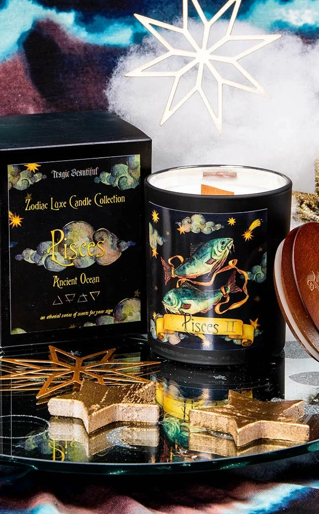 The Zodiac collection isΒ a collaboration betweenΒ Tragic Beautiful and fellow Australian indie designerΒ Luna Moth.Β Each candle isΒ hand-poured and madeΒ withΒ high-qualityΒ vegan soy wax. The wicks are wooden, which produce a strong flame and a natural cracking sound when burnt.Β The jar itself is matte black glass crowned with a wooden lid embossed with the Tragic Beautiful logo.